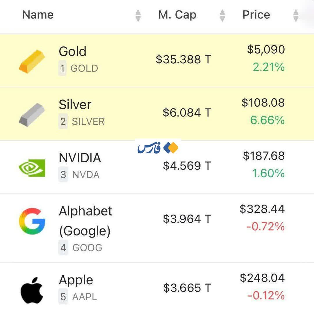 🔹ارزش بازار طلا در جهان به رقم بی‌سابقه ۳۵ تریلیون دلار رسیده؛ عددی که به مراتب از ارزش بازار بیت‌کوین و غول‌های فناوری مانند انویدیا و اپل هم بالاتر است.