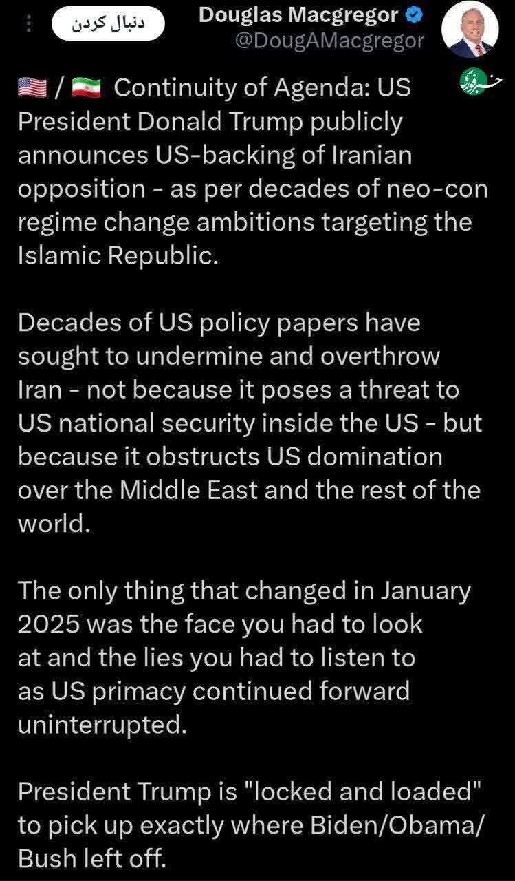 داگلاس مکگرگور، سرهنگ بازنشسته ارتش آمریکا و تحلیلگر نظامی: 🔹هدف آمریکا از دههها فشار بر ایران، امنیت داخلی نیست؛ بلکه